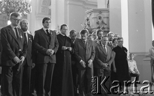 Pogrzeb Kardynała Stefana Wyszyńskiego - członkowie delegacji NSZZ "Solidarność". Od lewej: Jan Kułaj, ks. Henryk Jankowski, Anna Walentynowicz i Lech Wałęsa w otoczeniu dostojników kościelnych.