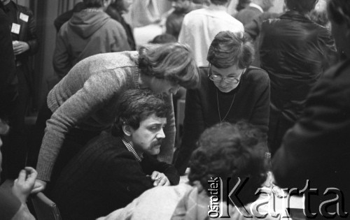 Posiedzenie Krajowej Komisji Porozumiewawczej NSZZ "Solidarność", które obyło się kilka dni po tzw. wydarzeniach bydgoskich. Na zdjęciu z mikrofonem Andrzej Celiński, obok siedzi Marian Jurczyk, Tadeusz Jedynak, Elżbieta Potrykus. Uczestnicy posiedzenia głosują unosząc legitymacje.