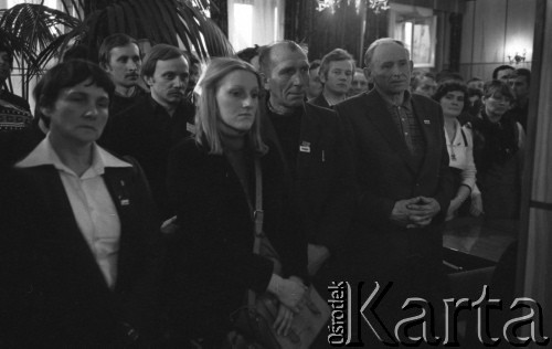 Msza święta w okupowanej siedzibie Wojewódzkiego Komitetu ZSL. Stoją m.in. (od prawej) Witold Hatka, Gabriel Janowski, Jan Kułaj, Lech Wałęsa, Roman Bartoszcze.