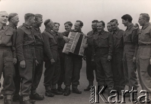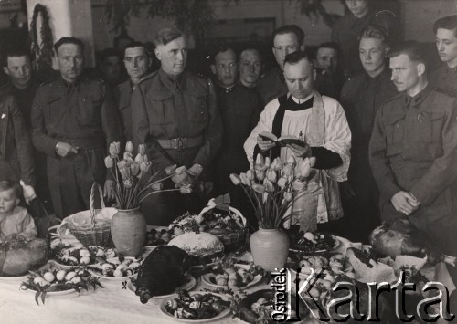 Polskie Siły Zbrojne na Zachodzie - żołnierze uczestniczą w modlitwie i święceniu pokarmu w Wielką Sobotę. Na stole znajdują się potrawy wielkanocne, pisanki oraz wiosenne kwiaty. Podpis na odwrocie: "Święcone".