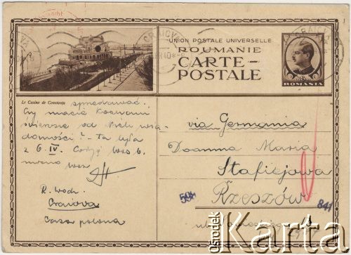 Polscy uchodźcy w Rumunii podczas II wojny światowej. Kartka pocztowa wysłana przez Roberta Wodzińskiego z Rumunii do Marii Stafiejowej z Rzeszowa [via Niemcy].