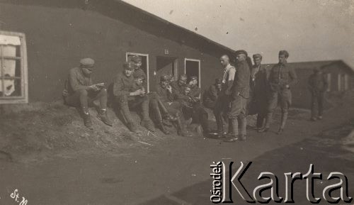 Niemiecki obóz dla internowanych jeńców wojennych - polskich legionistów w Szczypiornie, żołnierze leżący na trawie.