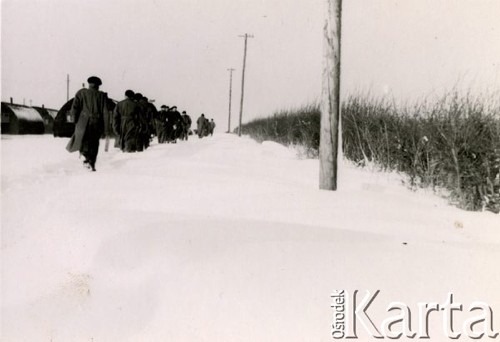 Żołnierze 2 Korpusu Polskiego, w tle blaszane baraki mieszkalne, tzw. "beczki śmiechu".