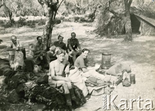 Uczestnicy walk o Monte Cassino przy wraku czołgu u podnóża góry Monte Cassino. Oryginalny podpis na odwrocie zdjęcia: "Rozbity czołg polski, który wdrapał się do podnóża Monte Cassino".