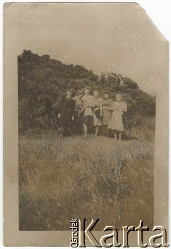 Grupa dziewcząt z Polski podczas niedzielnej wycieczki. Pracowały one w zakładach Kocha przerabiających odzież przywożoną z obozów koncentracyjnych.