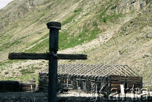 Były łagier, kopalnia uranu. Grupa osób obok drewnianego krzyża.