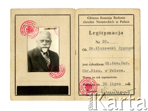 Legitymacja Zygmunta Klukowskiego należącego do Głównej Komisji Badania Zbrodni Niemieckich w Polsce. Z. Klukowski – lekarz, historyk regionalista, żołnierz Związku Walki Zbrojnej, Armii Krajowej (kierował Biurem Informacji i Propagandy w Zamojskim Inspektoracie AK, lekarz oddziałów partyzanckich). W czasie wojny gromadził zapisy z okresu okupacji: dokumenty ruchu oporu na Zamojszczyźnie, wspomnienia, dzienniki i relacje.