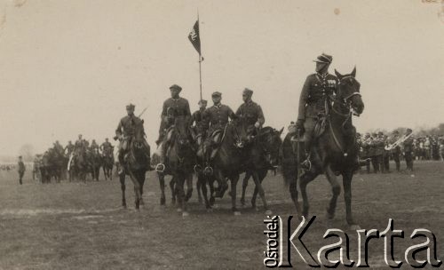 Uroczystość wojskowa (przysięga?), grupa żołnierzy i oficerów Wojska Polskiego z szablami i karabinami oraz księża. Stanisław Sławikowski już jako emeryt, po cywilnemu, stoi z tyłu w środku, w ciemnym garniturze.