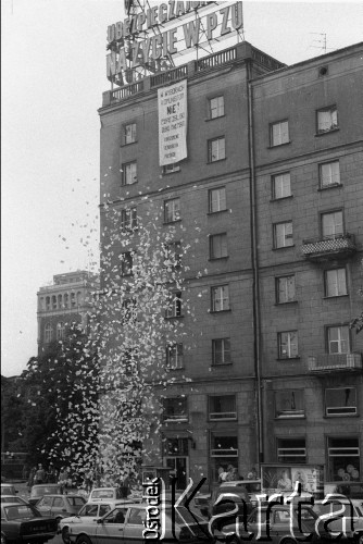 Ulica Świętokrzyska róg Marszałkowskiej. Akcja transparentowo - ulotkowa przed czerwcowymi wyborami.Transparent o treści: "Komunistom w wyborach NIE ! Porozumienie Demokratów Polskich". Konstrukcja przewieszek umożliwia doskonałe rozproszenie ulotek.