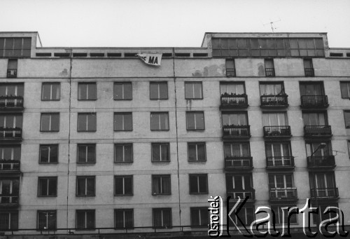 Ulica Marszałkowska przy Żurawiej. Akcja transparentowo - ulotkowa w obronie więźniów politycznych w Czechosłowacji i na Węgrzech. Zawieszony został transparent o treści: "Uwolnić Petera Pospichala i Zsolta Keszthelyi. Wolność i Pokój", z którego wypadło na chodnik 4 tys. ulotek. Na zdjęciu przechodnie czytający ulotki.