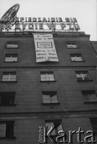 Ulica Świętokrzyska róg Marszałkowskiej. Akcja transparentowo - ulotkowa wzywająca do bojkotu referendum. Transparent o treści: "19 czerwca zostań w domu. Obejrzyj w TV Muppet Show.Grupy Oporu 'Solidarni'"; w okienku telewizora narysowana karykatura rzecznika rządu Jerzego Urbana.