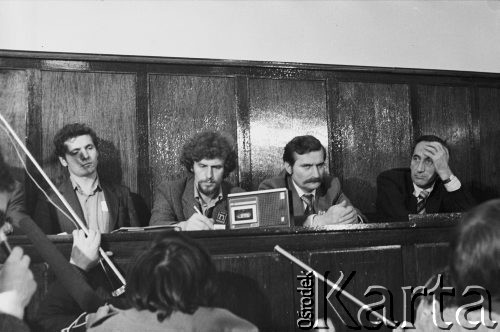Sąd Wojewódzki, rozprawa sądowa w sprawie rejestracji Niezależnego Samorządnego Związku Zawodowego "Solidarność". Delegacja "Solidarności" obecna na sali sądowej nie wyraziła zgody na rejestrację związku z samowolnie wprowadzonymi przez Sąd Wojewódzki zmianami. Siedzą od lewej: Zbigniew Bujak, Bogdan Lis, Lech Wałęsa i Tadeusz Mazowiecki.