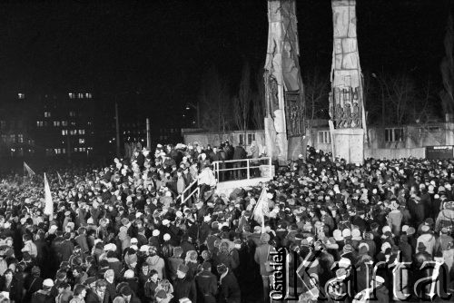 Uroczyste odsłonięcie Pomnika Poległych Stoczniowców. Tłum zgromadzony przed pomnikiem.