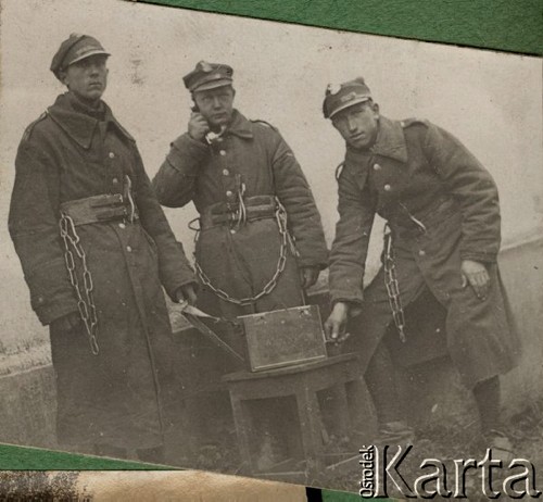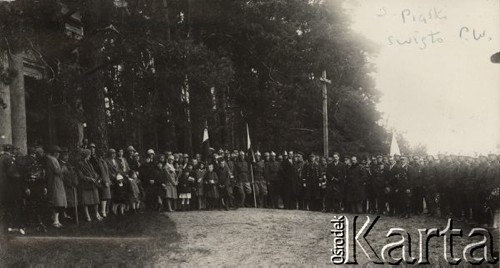Grupa osób przed kaplicą, z prawej stoją członkowie Związku Strzeleckiego. Podpis na fotografii "Poświęcenie pomnika".