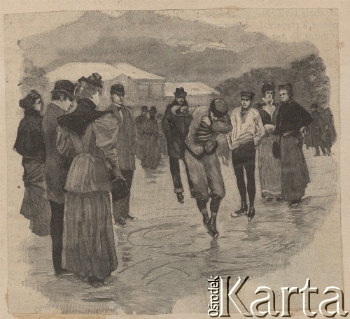 Rycina przedstawiająca osoby zgromadzone wokół meżczyzny dającego pokaz jazdy na lodzie.