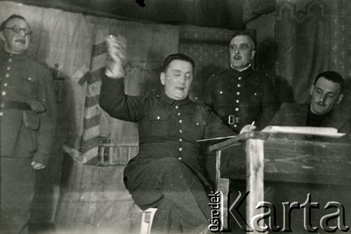 Obóz internowania żołnierzy Wojska Polskiego, grupa żołnierzy i oficerów WP przed barakiem, na którym widnieje namalowany orzeł wojsk lotniczych wz. 36. Niektórzy ze stojących układają na ziemi mozaikową flagę Jacht Klubu RP.