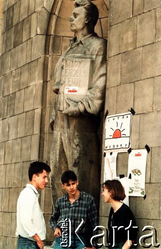 Kampania wyborcza przed wyborami samorządowymi w dniu 27 maja 1990 roku. Młodzi ludzie stoją przy rzeźbie na fasadzie Pałacu Kultury i Nauki.