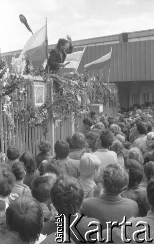Strajk okupacyjny w Stoczni Gdańskiej im. Lenina. Lech Wałęsa stoi na bramie stoczniowej otoczony tłumem, ogłasza podpisanie porozumienia z komisją rządową.