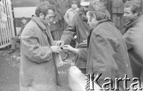 Strajk okupacyjny w Stoczni Gdańskiej im. Lenina. Robotnicy częstują się papierosami.