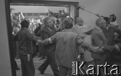 Strajk okupacyjny w Stoczni Gdańskiej im. Lenina. Członkowie komisji rządowej w sali BHP, prawdopodobnie opuszczają pomieszczenie, w którym negocjowali ze strajkującymi.