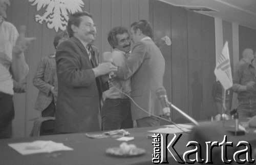Strajk okupacyjny w Stoczni Gdańskiej im. Lenina. Obrady w sali BHP. 2. z lewej stoi Lech Wałęsa, 1. z prawej Florian Wiśniewski, w środku Claude Sardais z francuskiego związku CFDT, który odwiedził Stocznię Gdańską i zadeklarował poparcie dla strajkujących oraz przekazał 11 tys. franków francuskich.