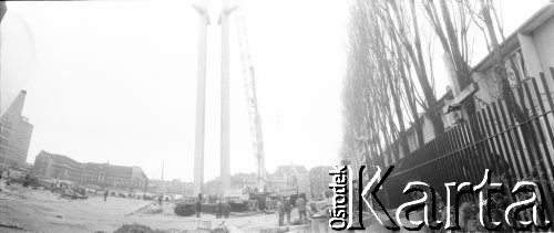 Plac budowy Pomnika Poległych Stoczniowców - robotnicy przy pracy.