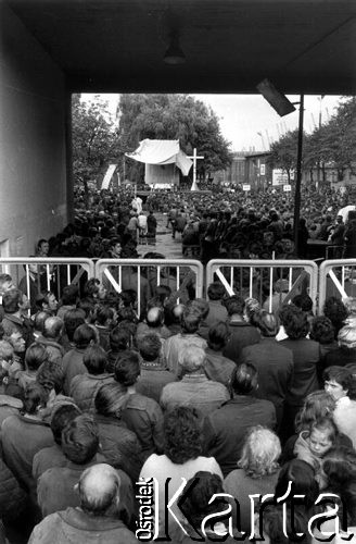 Strajk okupacyjny w Stoczni im. Komuny Paryskiej. Msza św. na terenie Stoczni, widok ołtarza z celebransem wygłaszającym kazanie.