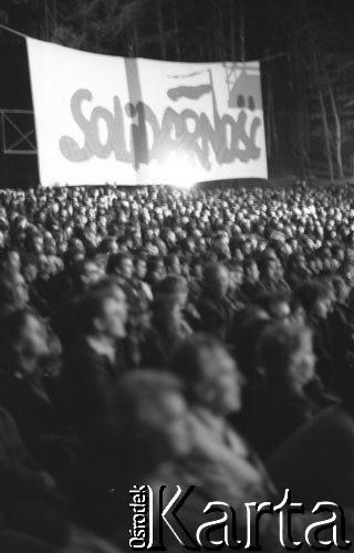 I Przegląd Piosenki Prawdziwej (reżyseria Marek Karpiński, scenografia Andrzej Czeczot). Na zdjęciu publiczność, w tle transparent z napisem "Solidarność".