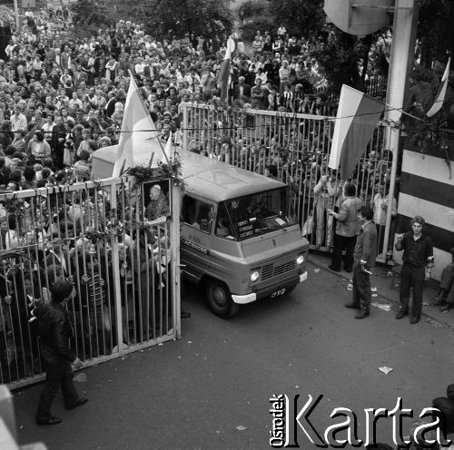 Strajk okupacyjny w Stoczni Gdańskiej im. Lenina.Ludzie modlą się przed bramą, na której zawieszono portret Jana Pawła II i biało-czerwone flagi.