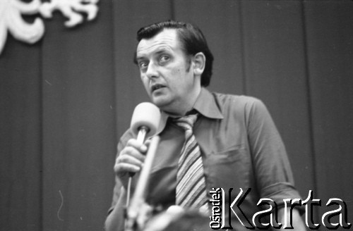 Strajk w Stoczni Gdańskiej im. Lenina. Sala BHP, obrady Międzyzakładowego Komitetu Strajkowego. Przemawia Florian Wiśniewski - elektryk z Elektromontażu.