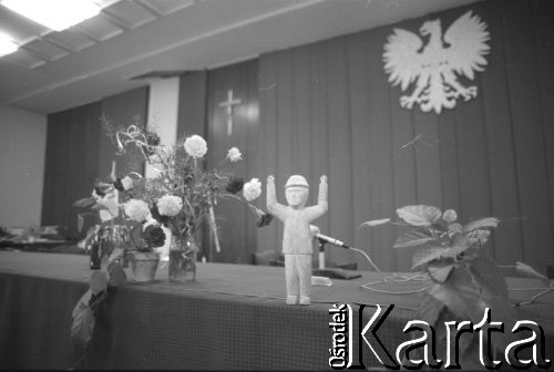 Strajk w Stoczni Gdańskiej im. Lenina. Sala BHP, przerwa w obradach Międzyzakładowego Komitetu Strajkowego. Przy stole prezydialnym mężczyzna z kartką z napisem "Solidarność".