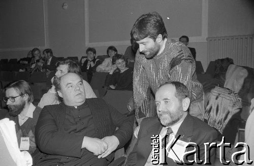 II Walne Zebranie Delegatów NSZZ "Solidarność" Regionu Dolny Śląsk. Władysław Frasyniuk rozmawia z ks. Stanisławem Orzechowskim, obok siedzi Adolf Juzwenko (1. z prawej).