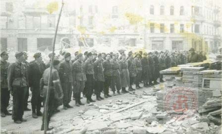 Powstanie warszawskie. Żołnierze 3 Batalionu Pancernego Armii Krajowej na zbiórce przy lejach po bombach.