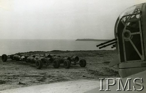 300 Dywizjon Bombowy, przygotowanie bomb przed załadunkiem do komory Wellingtona. Na bombie z lewej napis: "Od polskich lotników".
