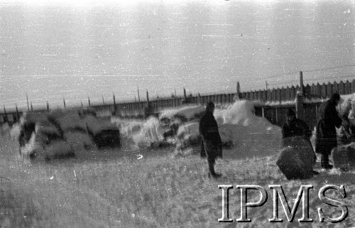 Paki z mundurami przysypane śniegiem na dworcu kolejowym. Na warcie żołnierze ze Szwadrownu Przybocznego (12 Pułk Ułanów) Dowództwa Armii Polskiej na Wschodzie.