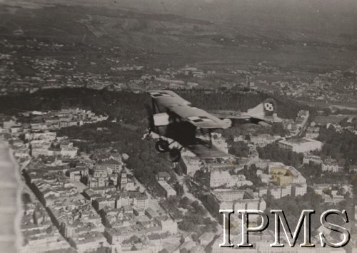 Samolot Ansaldo Balilla Eskadry im. Tadeusza Kościuszki lecący nad miastem.