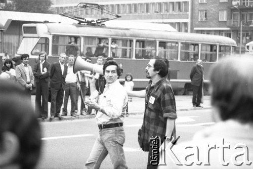 Strajk Miejskich Zakładów Komunikacyjnych, blokada ronda na skrzyżowaniu Alej Jerozolimskich i ulicy Marszałkowskiej. Na pierwszyn planie mężczyzna z megafonem.