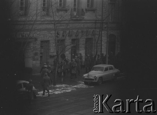 Strajk Studentów Uniwersytetu Warszawskiego, funkcjonariusze Milicji Obywatelskiej idący ulicą z pałkami. Fotografia wykonana z okna budynku Akademii Sztuk Pięknych.