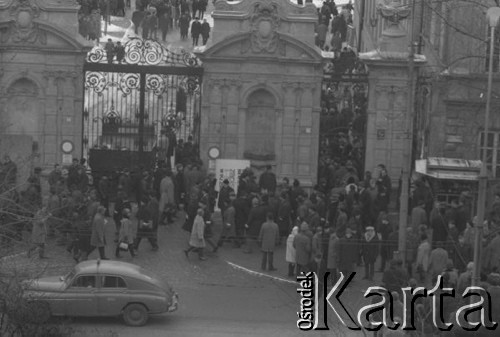 Strajk Studentów Uniwersytetu Warszawskiego. Tłum strajkujących studentów zgromadzony na dziedzińcu Uniwersytetu Warszawskiego i przed Bramą Główną. Fotografia wykonana z okna budynku Akademii Sztuk Pięknych.