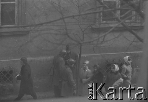 Strajk Studentów Uniwersytetu Warszawskiego, funkcjonariusze Milicji Obywatelskiej na Krakowskim Przedmieściu. Fotografia wykonana z okna budynku Akademii Sztuk Pięknych.