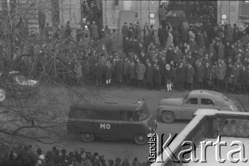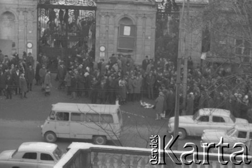 Strajk Studentów Uniwersytetu Warszawskiego, tłum na Krakowskim Przedmieściu przed Bramą Główną UW, na pierwszym planie samochód milicji. Fotografia wykonana z okna budynku Akademii Sztuk Pięknych.