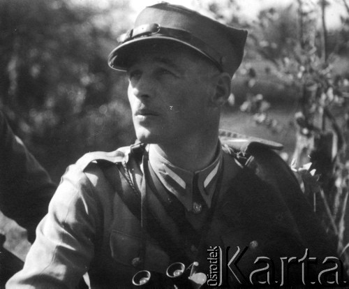 Por. Antoni Mordasewicz "Tatar", d-ca 2 szwadr. 5 Bryg. Part. AK przed frontem pododdziału zwiadu konnego 5 Bryg. na zbiórce we wsi.