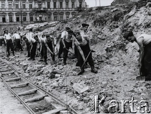 Odbudowa Warszawy - junacy z organizacji "Służba Polsce" na platformie wagonu kolejowego w okolicy ulicy Wielkiej (obecnie plac Defilad). W tle widoczny Prudential. Na transparencie napis: "PPB "Beton-Stal" wita młodzież Powszechnej Organizacji Służba Polsce przy odbudowie Warszawy".