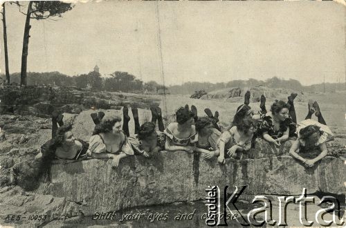 Grupa kobiet w scence rodzajowej - leżących nad wodą, opartych o skalny brzeg i spoglądających w jednym kierunku. Podpis pod fotografią w języku angielskim: "Shut your eyes and choose" [tłum. Zamknij oczy i wybierz].