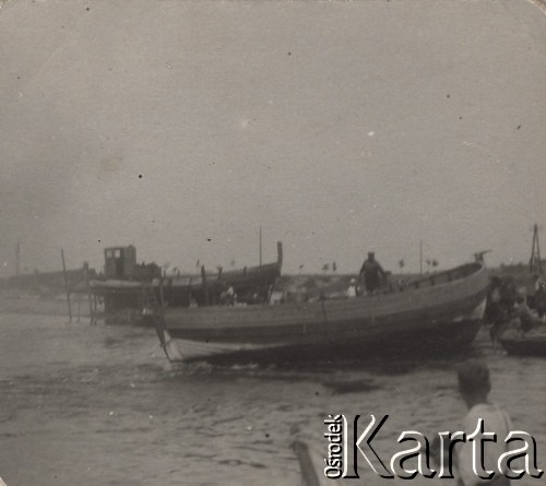 Rejs Wisłą do Bałtyku Julii Szymanowskiej (Lila) i prof. Ramczykowskiego. Na zdjęciu łodzie rybackie wyciągnięte na brzeg.