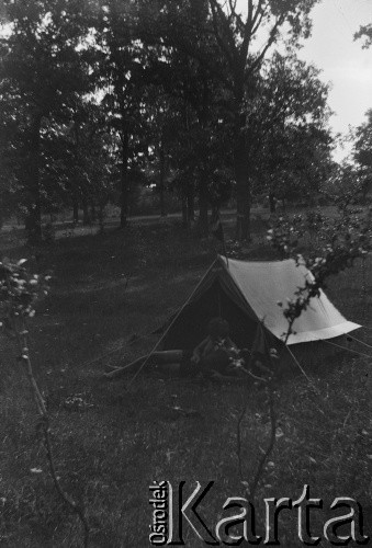 Biwak podczas spływu kajakowego, n/z Witold Lis-Olszewski przed namiotem.