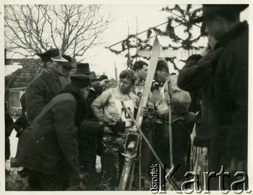 Łemkowie na mecie podczas odpoczynku piją ciepły napój. W czasie IV marszu zimowego Huculskim Szlakiem II Brygady Legionów Polskich brali udział w zawodach jako patrol narciarski.
