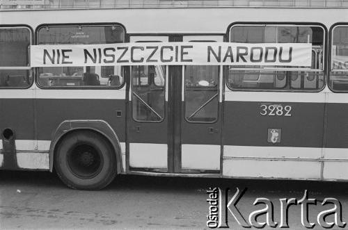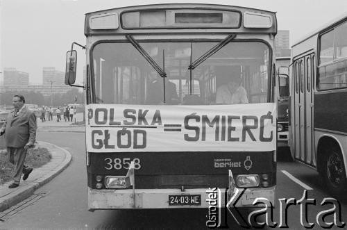 Blokada ronda na skrzyżowaniu ulicy Marszałkowskiej i Alei Jerozolimskich. Kierowcy autobusów miejskich i ciężarówek w ten sposób protestowali przeciwko obniżce kartkowych przydziałów mięsa i trudnościom zaopatrzeniowym. Strajk został zorganizowany przez Zarząd Regionu Mazowsze NSZZ "Solidarność". Na zdjęciu transparent na autobusie o treści: "Nie niszczcie narodu".