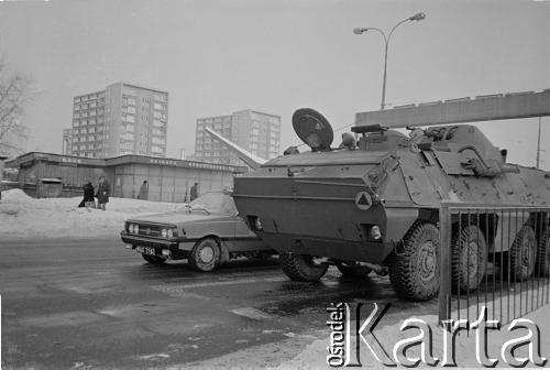 Transporter opancerzony na ulicy Cietrzewia na Włochach. Zdjęcie zrobione z okna na poddaszu domu Małgorzaty Niezabitowskiej i Tomasza Tomaszewskiego.