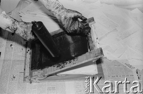 Podziemna drukarnia. Druk ulotek na ramce drukarskiej.